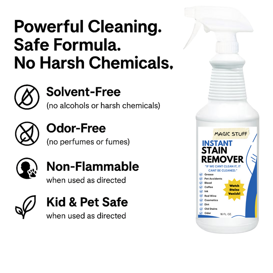 It’s solvent-free, odor-free, and non-flammable — safe to use around kids, pets, and on most household fabrics.